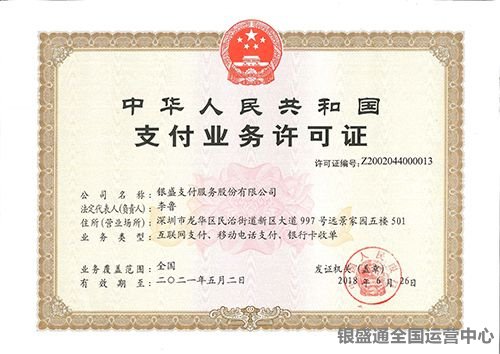 銀盛支付服務股份有限公司(簡稱“銀盛支付”)成立于2009年7月,總注冊資本為1.4億元,2011年獲《支付業務許可證》,是首批27家機構之一,并在2016年成功續展支付牌照。目前,銀盛支付在全國擁有34家直營分公司,業務遍及220余個地級市,擁有100多萬商戶。