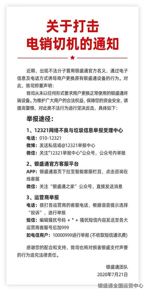 銀盛支付和隨行付也發(fā)布了聲明,稱從未通過短信或電話等形式進(jìn)行終端更換等活動(dòng),請(qǐng)用戶勿輕信,歡迎廣大用戶對(duì)上述行為進(jìn)行投訴。