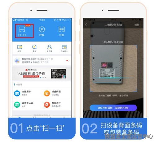 進入app首頁,點擊掃一掃,使用手機的攝像頭對準銀盛通的條形碼進行掃描,掃描如圖所示。