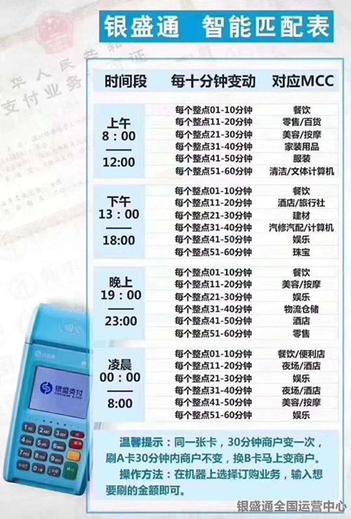 銀盛通epos將一天24小時(shí)劃分為四個(gè)時(shí)間段,各時(shí)間段的每小時(shí)又分為6個(gè)區(qū)間(每個(gè)區(qū)間十分鐘),每個(gè)區(qū)間對(duì)應(yīng)不同的MCC碼;如果用戶(hù)需要某個(gè)特定的商戶(hù)類(lèi)型,只要在特定的時(shí)間刷卡消費(fèi)即可。銀盛通商戶(hù)變化表如下: